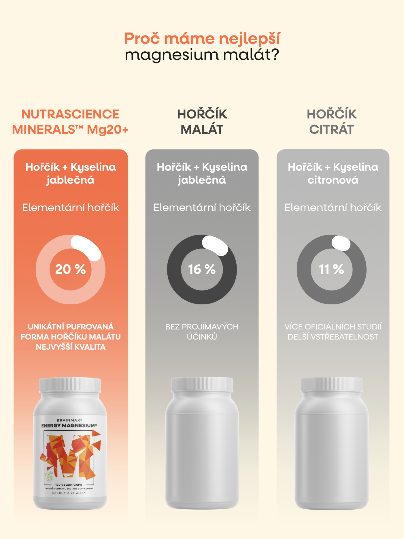 Energy Magnesium® obsahuje unikátní pufrovaný hořčík malát Nutrascience Minerals™ Mg20+, vyvinutý na základě poznatků o rozpustnosti a stabilitě minerálů v trávicím traktu. Tato forma kombinuje kyselinu jablečnou, která v žaludku zlepšuje rozpustnost hořčíku a podporuje jeho přeměnu na iontovou formu, s vyváženým pufrováním, které zajišťuje stabilitu směsi a šetrnost k trávení. Při průchodu střevem kyselina jablečná udržuje hořčík v rozpustné formě a brání jeho zpětnému srážení do nerozpustných solí. Díky tomu zůstává hořčík biologicky dostupný a snadněji využitelný.